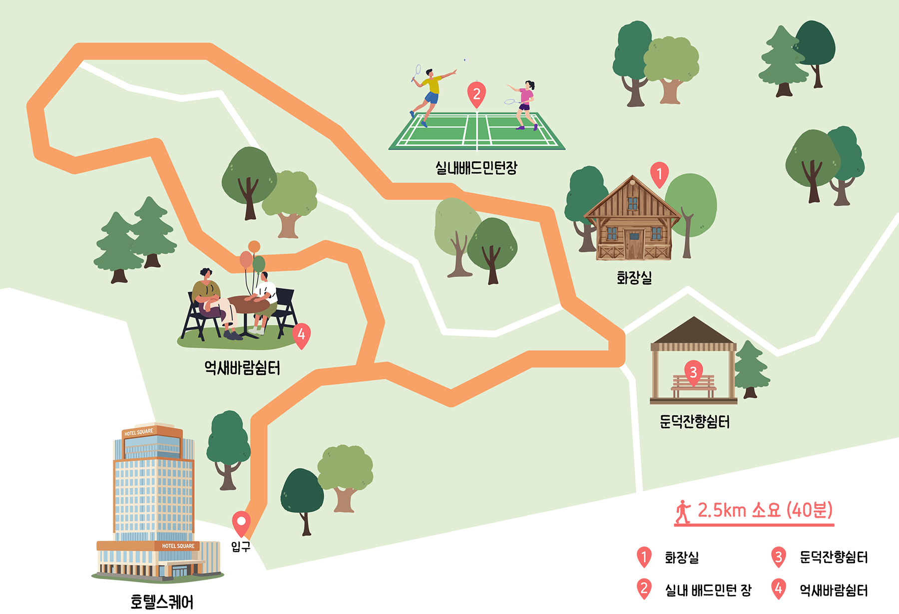 총 2.5km, 약 40분이 소요되는 코스로 누구나 부담 없이 걸을 수 있어 많은 고객분들께 사랑받고 있습니다.
